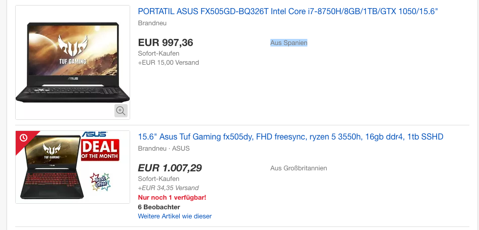 Bei der Auflistung der Angebote sehen Sie rechts vom Preis aus welchem Land der Artikel versandt wird (z. B. „Aus Spanien“). Die Versandkosten werden von ebay entsprechend Ihres Standortes (Deutschland) angepasst. Bei britischen Angeboten findet eine Umrechnung von Pfund in Euro statt.